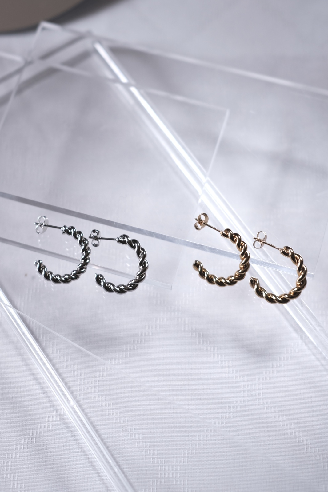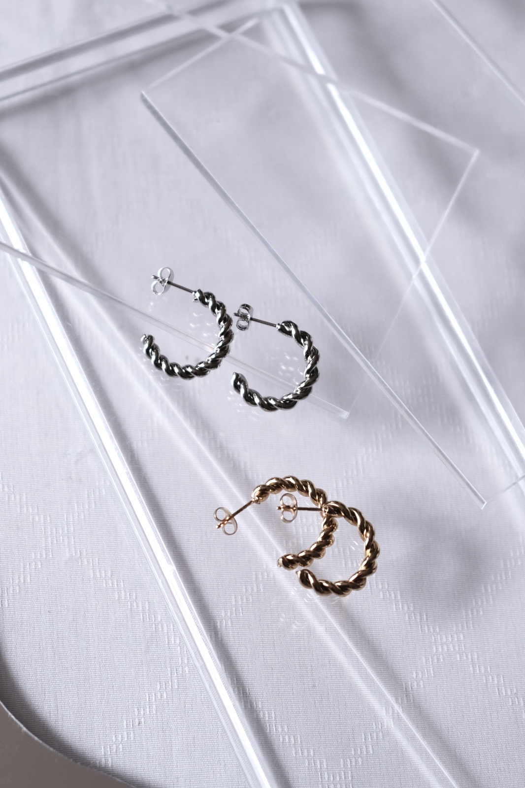 陰影のあるツイストデザインが特徴的なC型フープピアス。