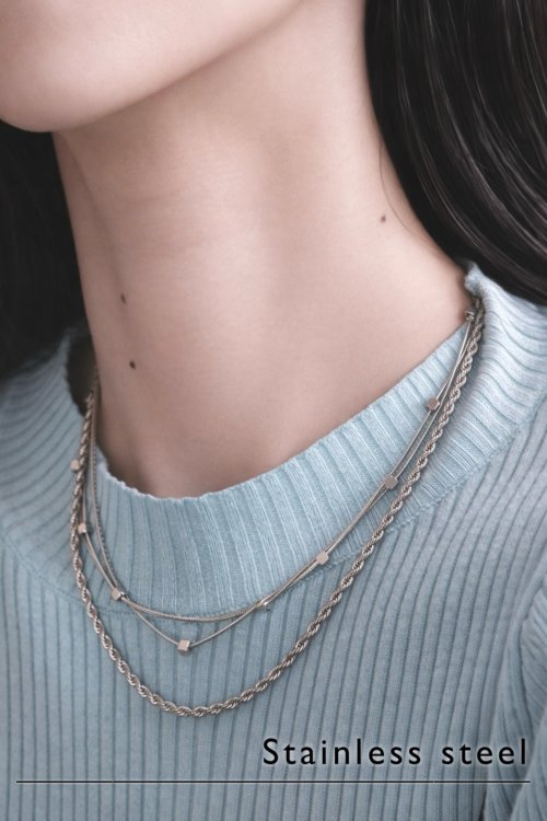 タイプ別チェーンのレイヤードが特徴的なネックレス。